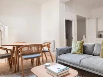 Set on the garden level of an elegant period block, this unexpected home is a gallery of timeless design. From the entranceway, considered details – wainscoting, warm lighting and a coffered ceiling – set the scene for elevated living. The open-plan kitchen, dining and reception room forms the heart of the home. There’s a sense of opulence to this space, from the Herringbone floors to intricate panelling and a glossy gilded media wall. A bay window with French doors beckons in natural light, lending an uplifting feel to the reception space, centred around a boucle sofa. Considerately set into the rear of the room, a contemporary kitchen is elevated with Miele appliances, marble counters and thoughtful lighting. Matte black pendant lights crown a breakfast bar, or there’s a dining table with seating for six. Elsewhere, a dedicated study space leads the way through to the distinguished principal bedroom suite. Denim blue walls make a statement here, with daylight flooding in courtesy of